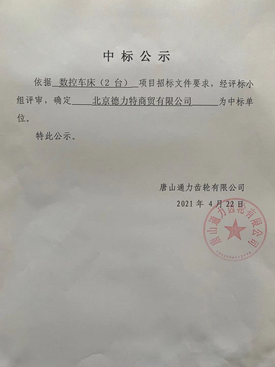 唐山通力齿轮有限公司数控车床(2台)设备采购中标公告