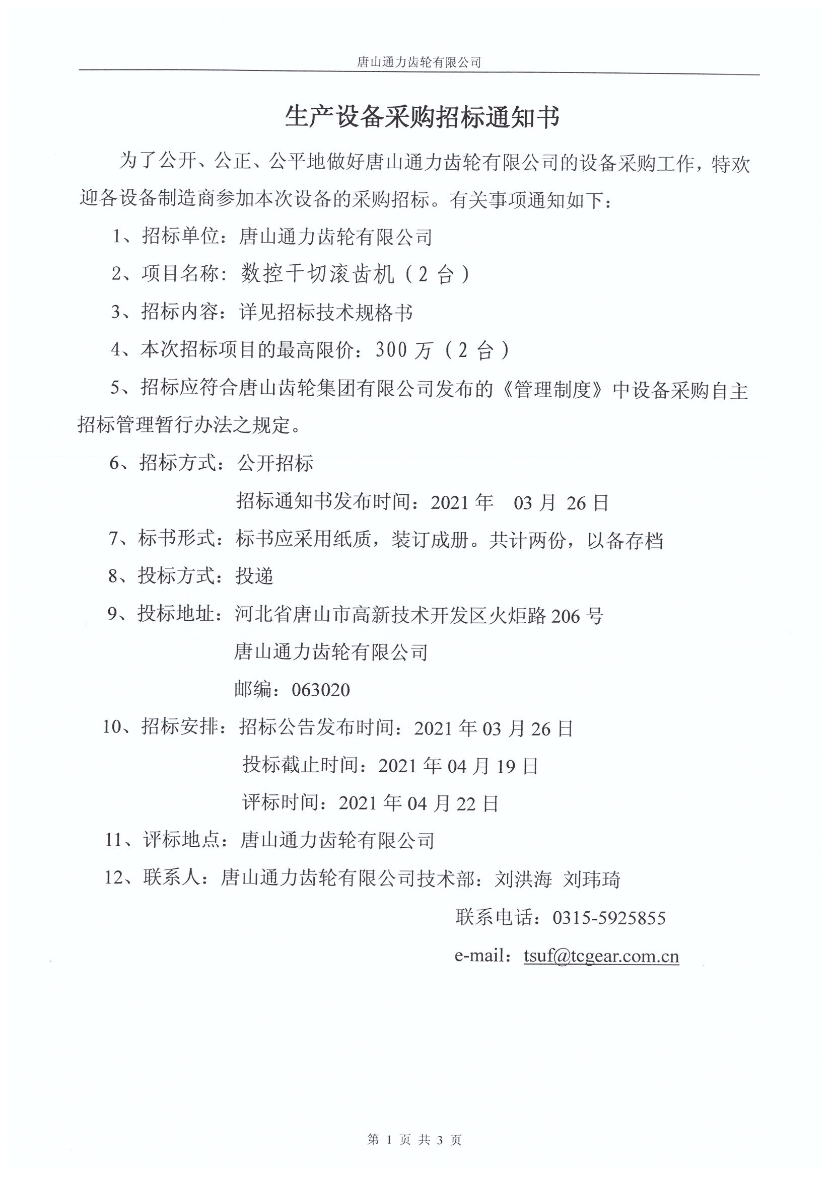 【概要描述】唐山通力齿轮有限公司数控干切滚齿机(2台)设备采购招标公告
